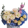 The Azure Whisper Flower Box is a soothing blend of soft blue and creamy ivory tones, thoughtfully arranged to evoke tranquility and grace. Featuring lush blue hydrangeas paired with delicate ivory blooms and subtle greenery, this arrangement is housed in a minimalist white box that enhances its clean, contemporary look.