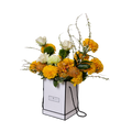 The Golden Aura Flower Box is a bold and uplifting arrangement that celebrates joy, optimism, and elegance. Featuring a striking mix of golden-yellow blooms, soft white roses, and fresh green textures, this design is elevated with natural branch accents for a modern, sculptural finish.