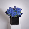 The Midnight Azure Hydrangea Box is a refined statement arrangement featuring voluminous blue hydrangeas accented with soft greenery and wrapped in rich navy tones. Presented in a sleek black designer box, this composition embodies confidence, depth, and contemporary elegance.