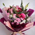 The Velvet Blush Symphony bouquet is designed to captivate with contrast, depth, and elegance. Featuring a harmonious mix of pink lilies, roses, carnations, textured seasonal blooms, and fresh greenery, this arrangement balances softness with vibrant character.